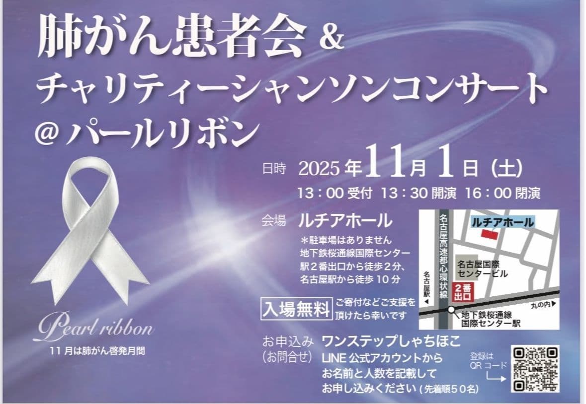 5月のRosegroupeツアーの名古屋公演での“ワンステップしゃちほこ”の皆様とのご縁で、11月1日のパールリボン・デー(肺がんの早期診断・早期発見・早期治療)に名古屋市ルチアホールでコンサートを開催いたします。
